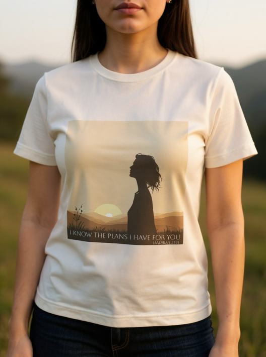 Your story is already written in victory! Wear the promise that brings peace-even when the path is unclear, His plans are sure. "I Know the Plans I Have for You"-a reminder that God's purpose is unfolding beautifully in your life. Jeremiah 29:11, Philippians 4:7, Deuteronomy 31:6
